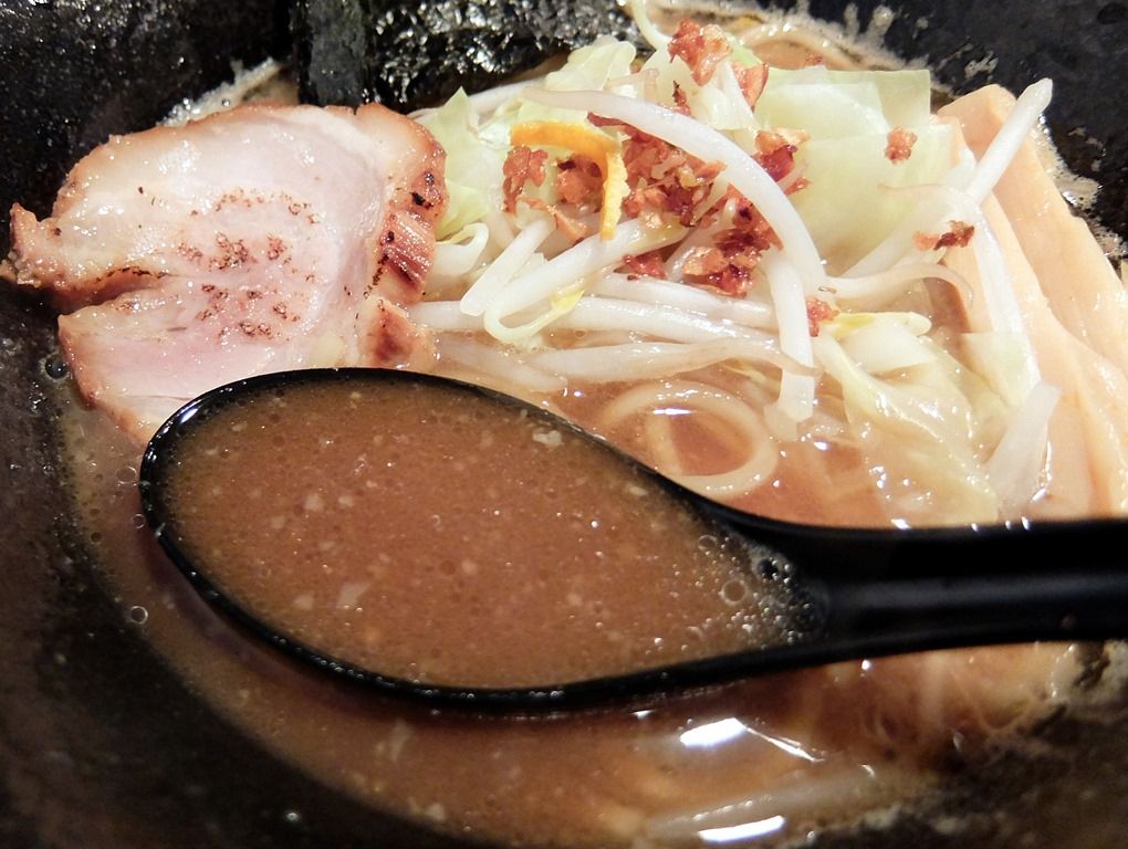 スープは、少しとろみのある醤油味。 細かい背脂の浮いた動物性メインのスープで、ファーストアタックはちょっと家系風。