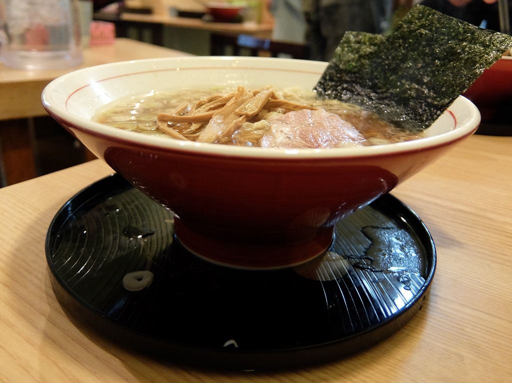 一見クラシカルなラーメン丼ですが、サイドラインが切立丼のような器で、丸いお盆に載って登場。具は、海苔、メンマ、チャーシュー、きざみネギ。