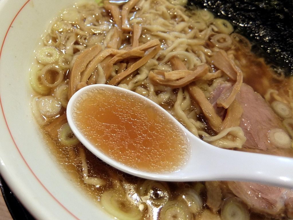 スープは、さらさらの清湯醤油味。 大変あっさりとした出汁に、香味油が強めに効いて、いいポイントでバランスを形成。