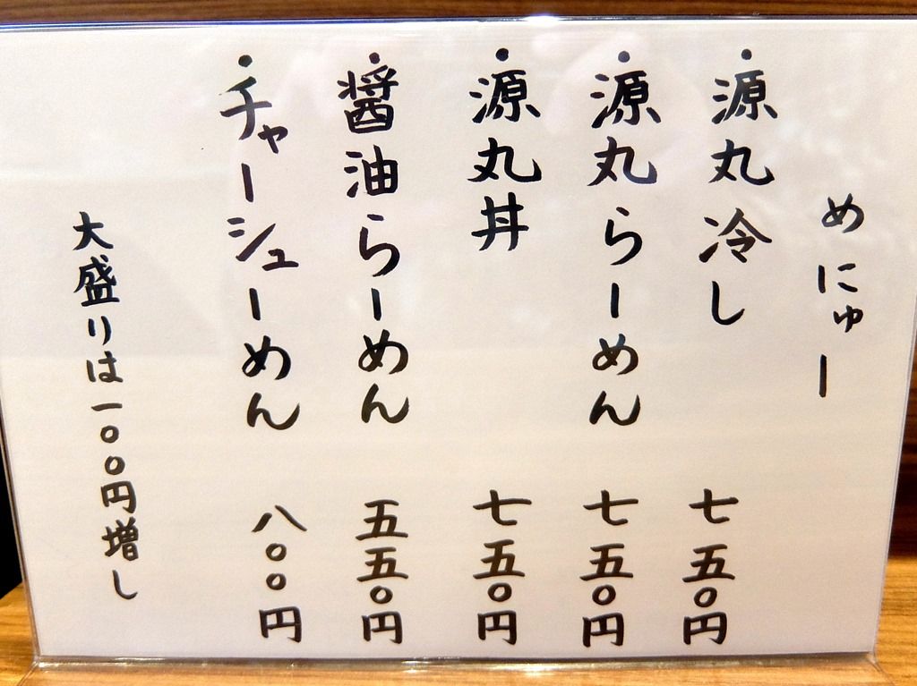 「めにゅー」裏は、サイドメニュー・ドリンク。 カウンターには、「源丸冷し」のカラー写真入り解説も。