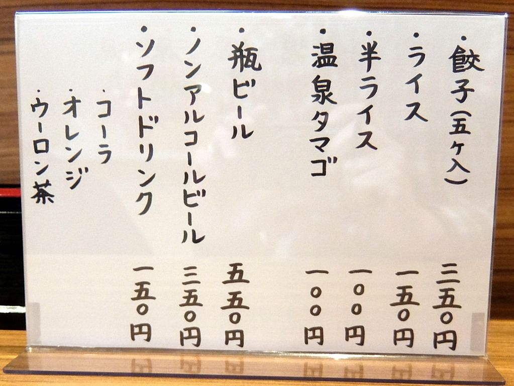 券売機は無く、後会計制。 卓上メニュー立ての「めにゅー」より、主なメニューは、
