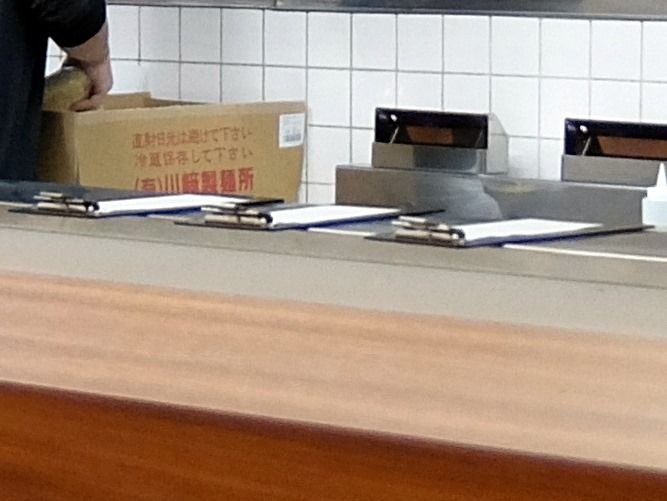 店内は、厨房前に真っ直ぐなカウンター5席、4人卓x2。 11:00ちょうど到着で、一番海苔~w