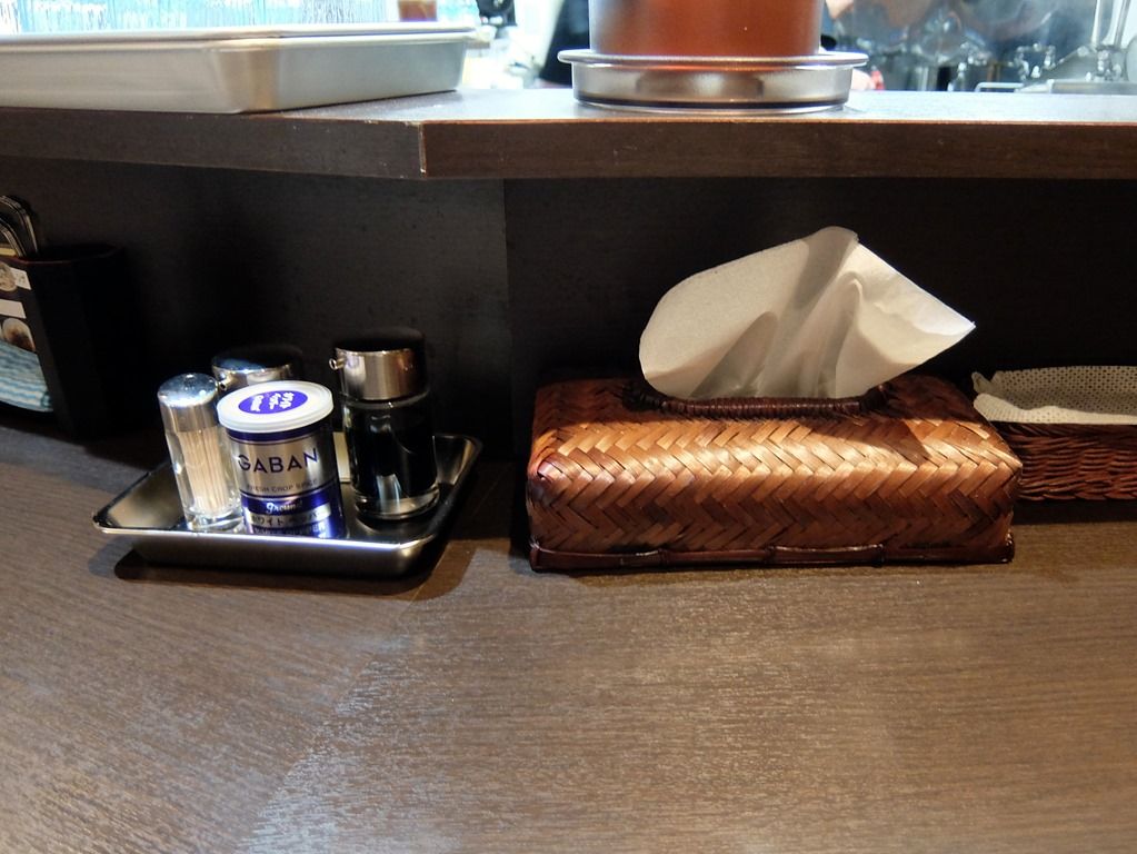 卓上調味料は、GABANホワイトペッパー、醤油、酢。