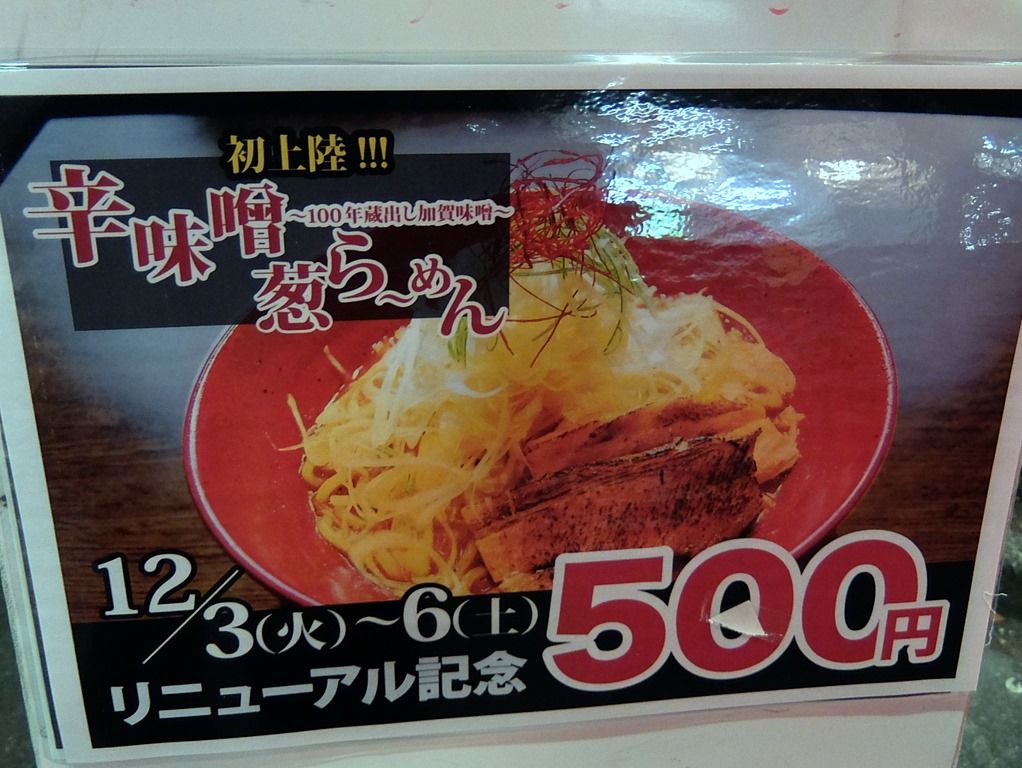 12月1日、リニューアル初日は、「辛味噌葱ら~めん」1杯100円で提供したそうな!