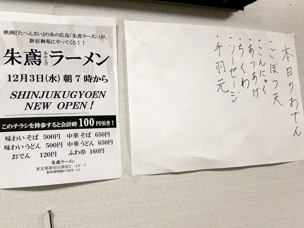 2014年12月3日オープン。三ノ輪にある朱鳶ラーメンの暖簾分け店。俳優の沖正人さんがオーナで、2014年8月24日に上町でオープン。今回、上町から新宿御苑前に移転。上町店オープン時は、ワタシもツイートしましたが、タイミングが合わず結局行けずじまい。って事で、今回は早めの訪問w