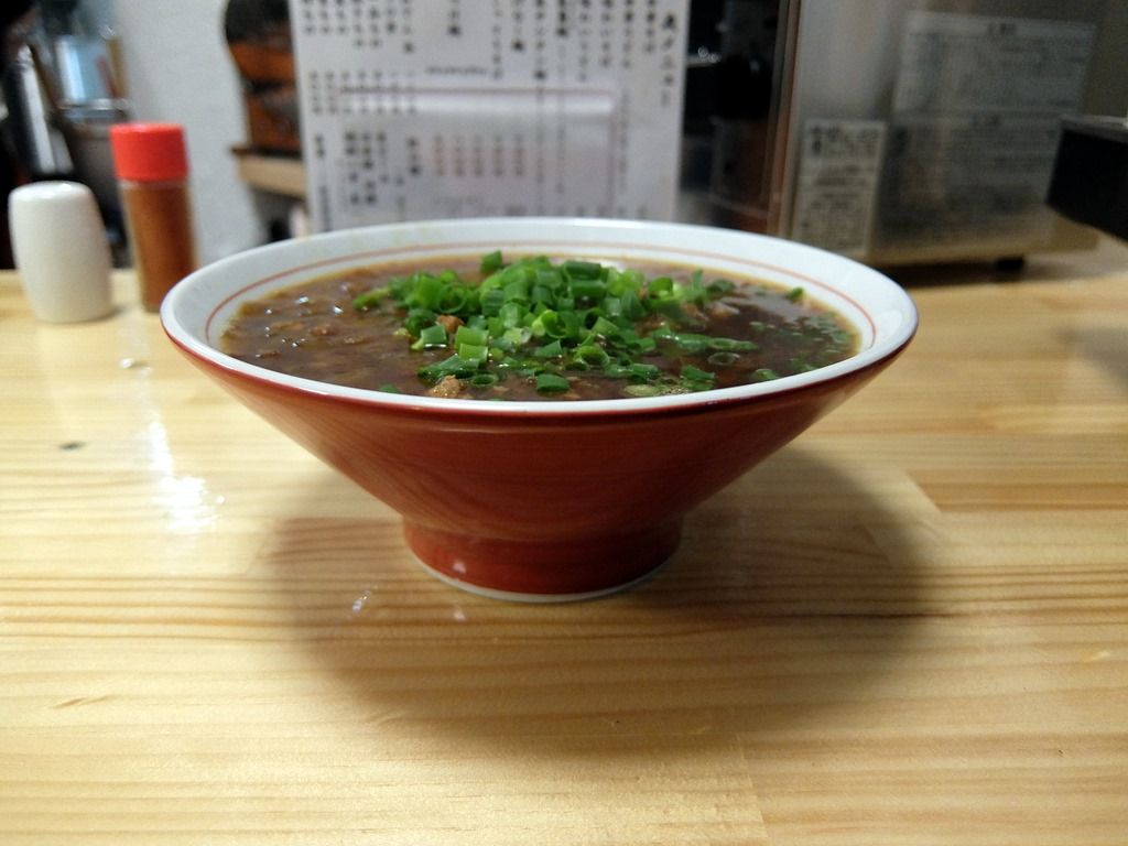 「中華そば」と同じ縁の赤い丼で登場。 具は、玉ねぎ、ひき肉。きざみ青ネギ。