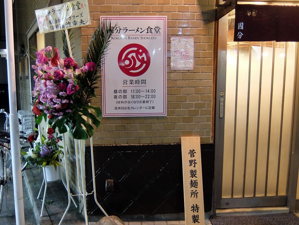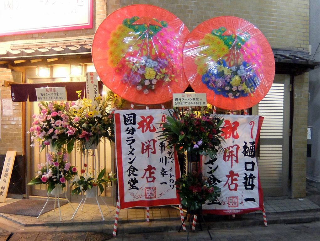 店頭脇のひときわ大きく目を引く花輪は、中華ソバイチカワさんから。