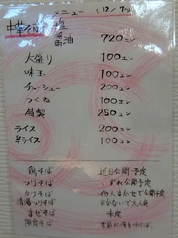 訪問時(12/10)の主なメニューは、中華そば 塩・醤油 各720円、他。