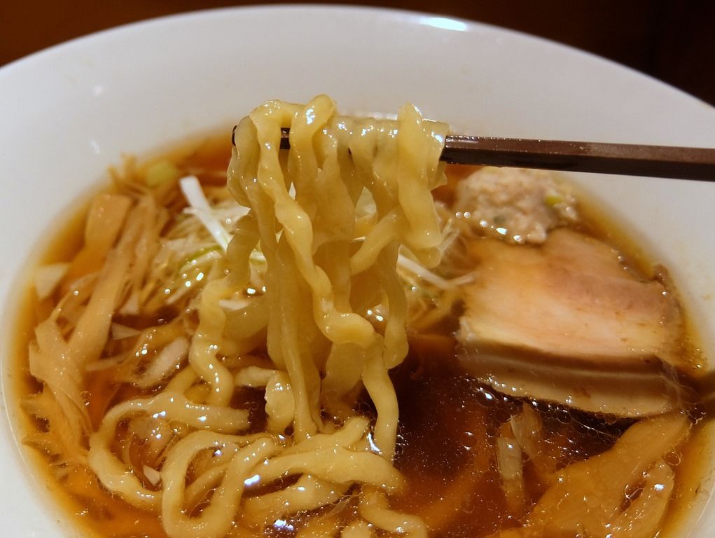 麺は、菅野製麺所製の平打ち中太縮れタイプ。