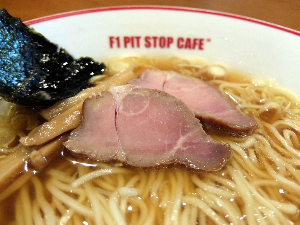 丼に内側に書いてあるロゴが気になって、ちょっと海苔を横へ。 「F1 PIT STOP CAFE」とありました。