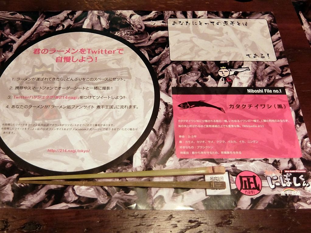 席には、煮干しがデザインされたランチョンマットと洗い箸がセッテイングされています。