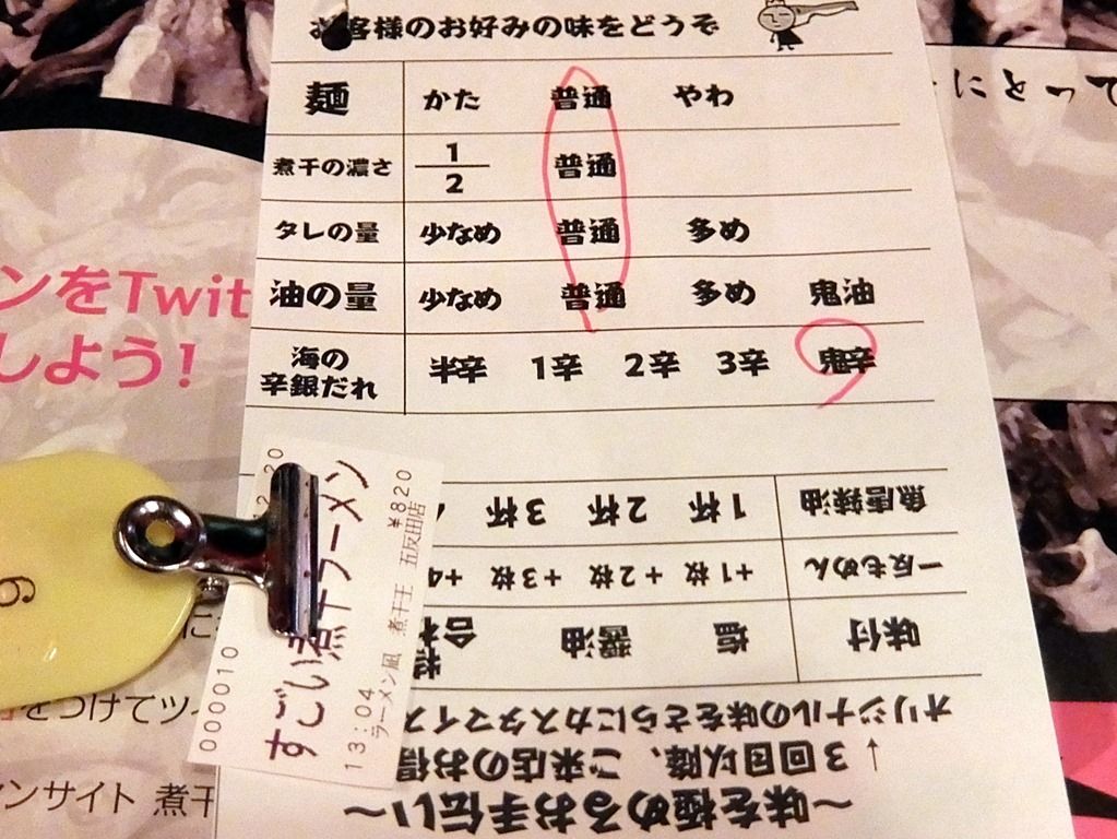 麺のかたさ・煮干しの濃さ・タレの量・油の量・辛さをそれぞれ指定。
