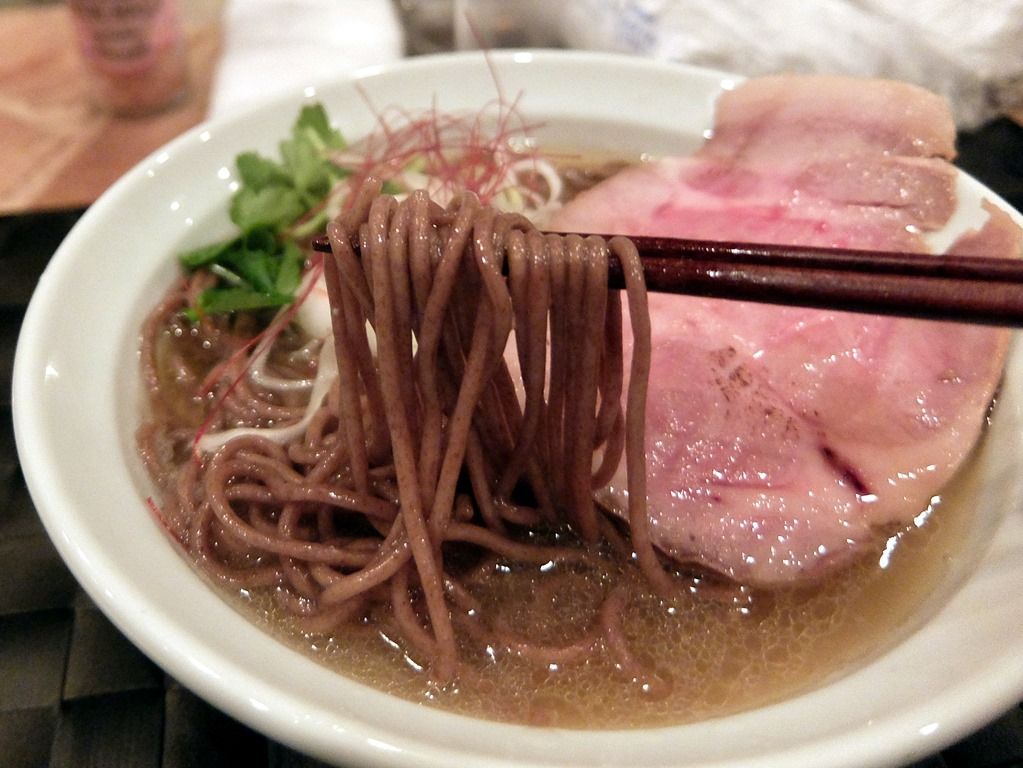 黒くて中細ストレートの麺は、見た目まるで日本蕎麦の様。