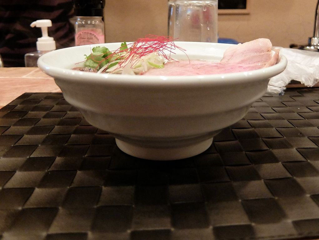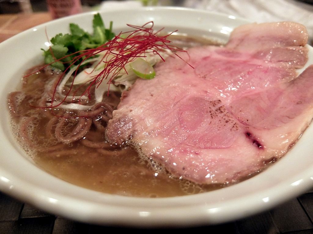 チャーシューは、低温調理のピンクレアタイプを提供直前にバーナーで軽く炙ったもの。チャーシューがとにかくデカくて厚くて、軽く200g以上はありそう^^; しかも柔らかで肉本来の味がしてウンマイ!