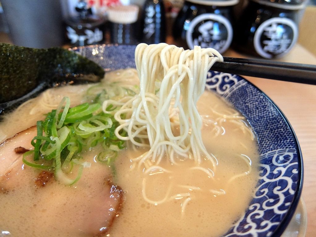 豚骨使用量は全国トップクラスで超濃厚スープのため、あえてスープとなじみにくい低加水の超極細麺使用とか。博多ラーメンとしては、ごく普通の組み合わせ的な^^;