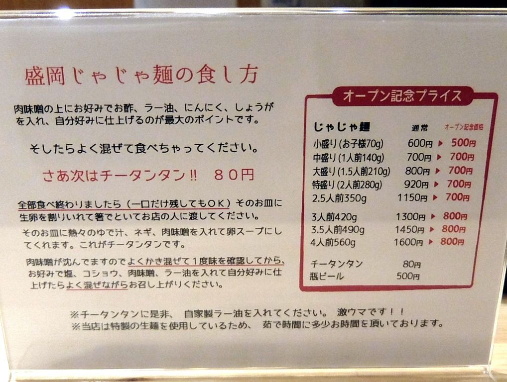 現在オープン記念プライスで、じゃじゃ麺 小盛り・大盛り100円引き、特盛り120円引きセール、盛りが大きければ大きいほど割引額が多いというセール実施中。ですが、一番売れ筋の中盛りは値引きなしとか、ちょっと残念な感じの記念セール。