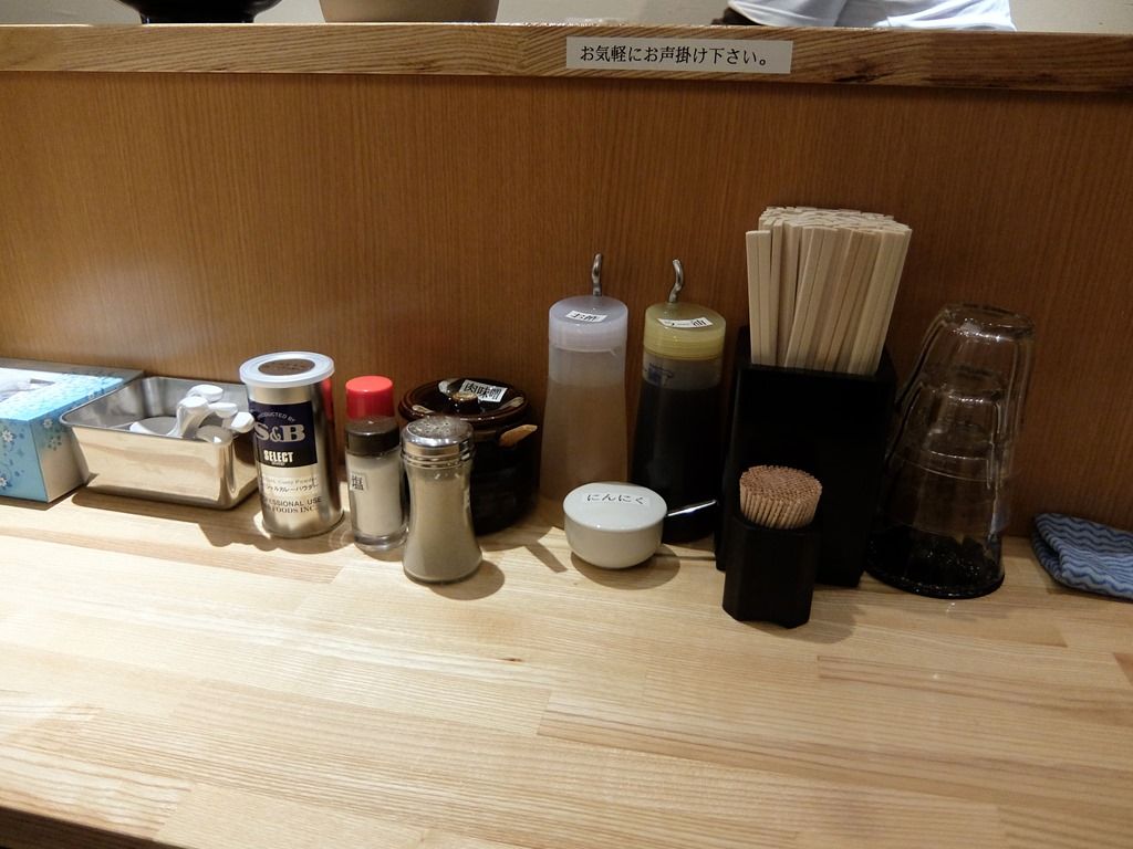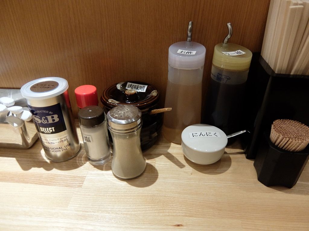 卓上調味料は、酢、ラー油、にんにく、肉味噌、白胡椒、塩、一味唐辛子、S&Bカレーパウダー。