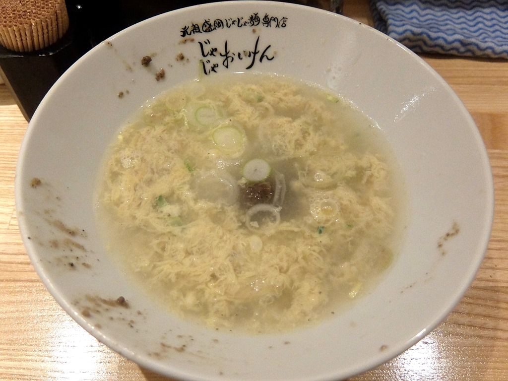「じゃじゃ麺」の〆は、「チータンタン」80円。 麺を食べ終えた器に卓上の卵を割り入れて、良くかき混ぜてスタッフに渡すと、熱々のゆで汁、ネギ、肉味噌を足してくれます。