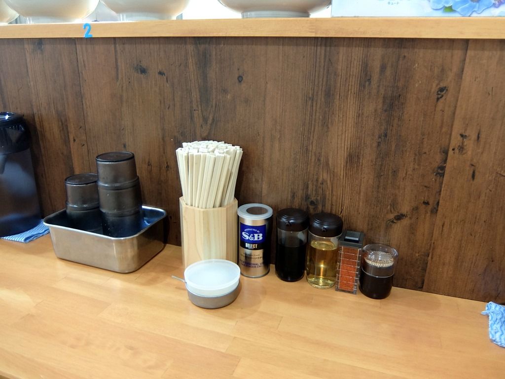 卓上調味料は、S&Bブラックペッパー、タレ?、酢、一味唐辛子、タッパに入っているのはにんにく。