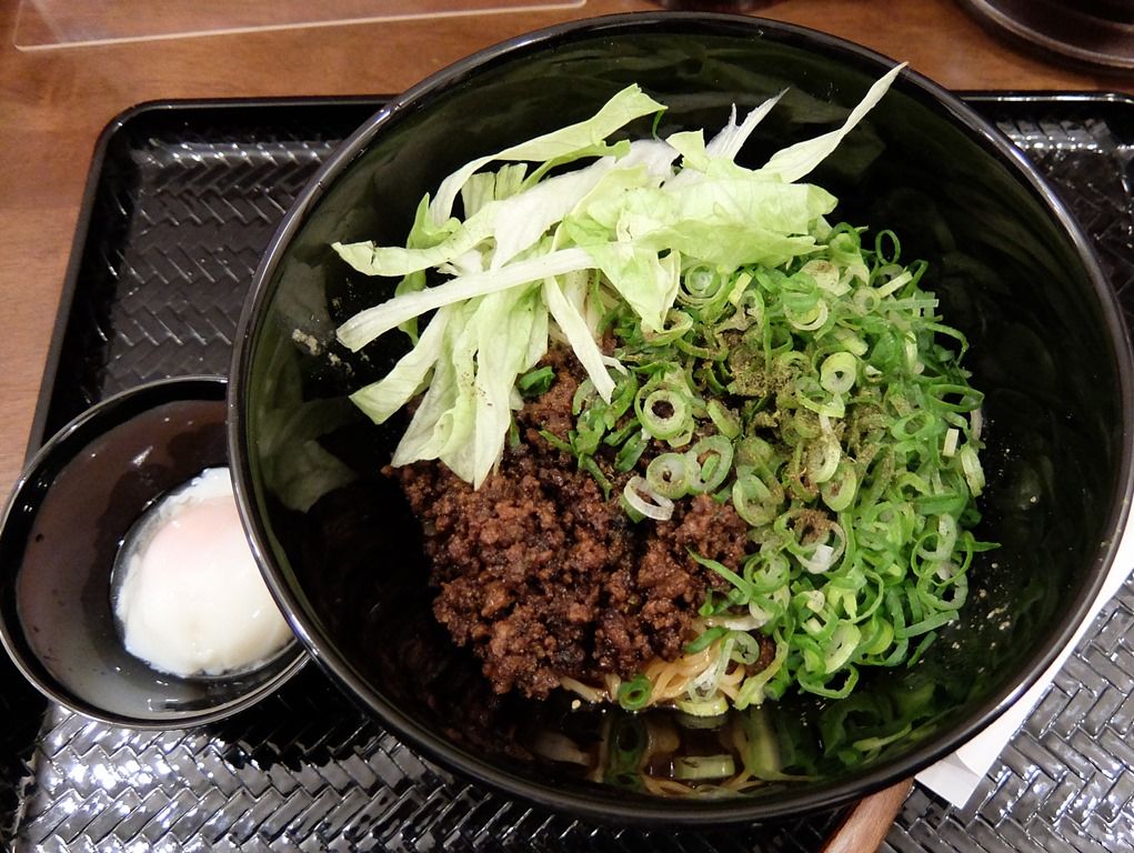 黒い器で、黒いトレーに載って登場。 提供時、「麺の白い部分がなくなるまでしっかり混ぜてお召し上がり下さい」と、アナウンスがあります。