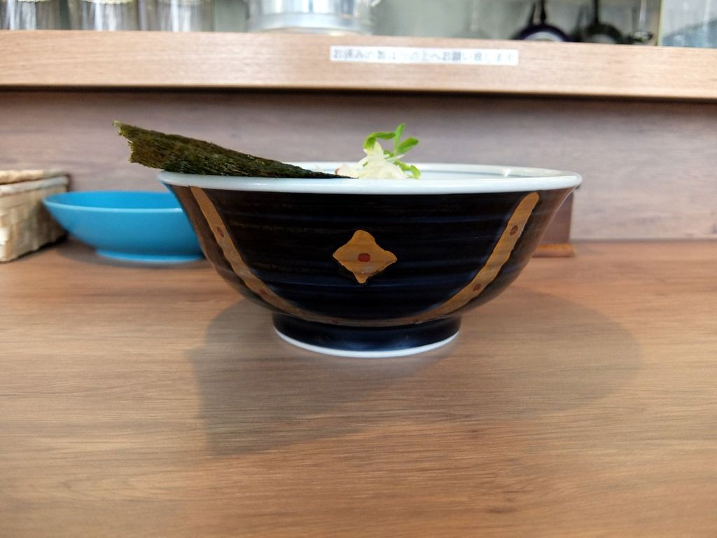 開口部の広いどっしりと安定感のある玉淵丼で登場。 サイドが鮮やかなブルーで、特報的なゴールドの模様入りです。