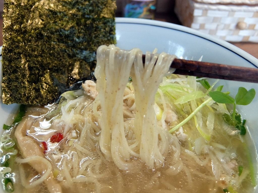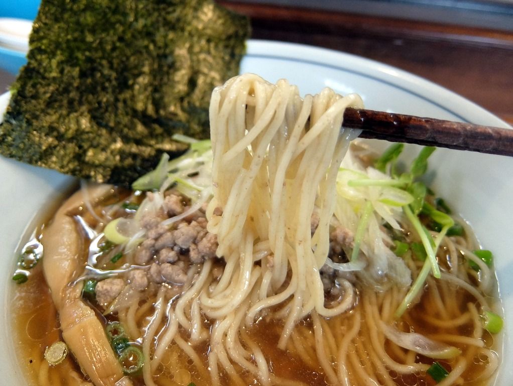 麺は、三河屋製麺のストレート中細タイプ。良く見ると黒い粒粒があり、全粒粉配合麺。 しなやかで啜り心地がよく、淡麗スープに細麺の組み合わせなのに、麺にしっかりスープが載ってきます。