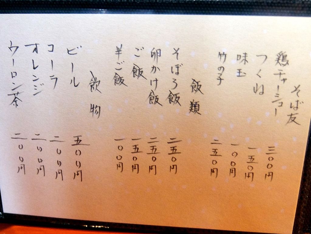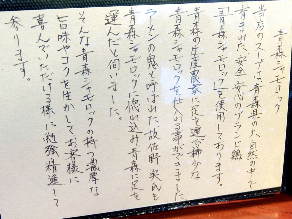 トッピングは、「そば友」表記。 メニューラス2ページは、「青森シャモロック」の説明。