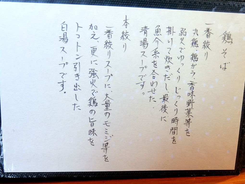 メニューブック1ページ目は、スープの説明。「一番絞り」は鶏プラス魚介系の清湯スープ。「本絞り」は、一番絞りは、「一番絞り」スープにモミジ等を加えて強火で炊き出した白湯スープ。