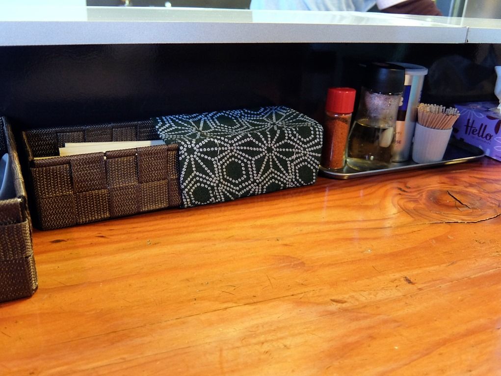 箸は割り箸。 卓上調味料は、S&Bブラックペッパー、一味唐辛子、酢。
