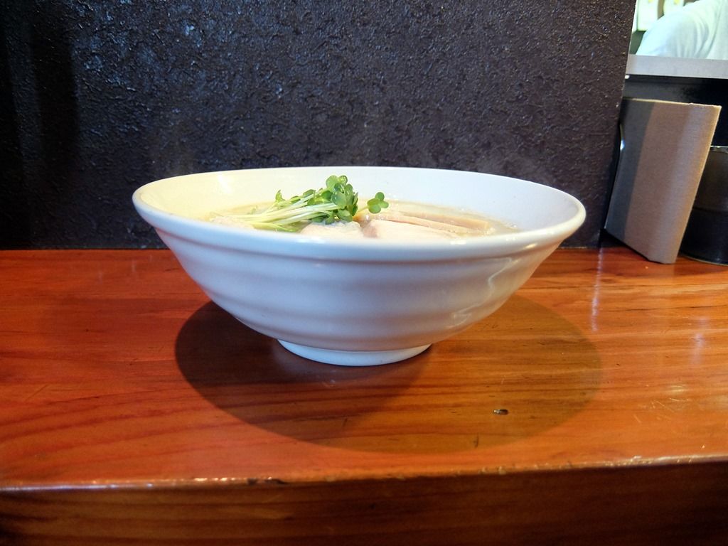 背が低くて口径の広い、玉渕丼型の器で登場。 具は、カイワレ、きざみネギ。メンマ代わりのタケノコ、鶏チャーシュー、つくね。