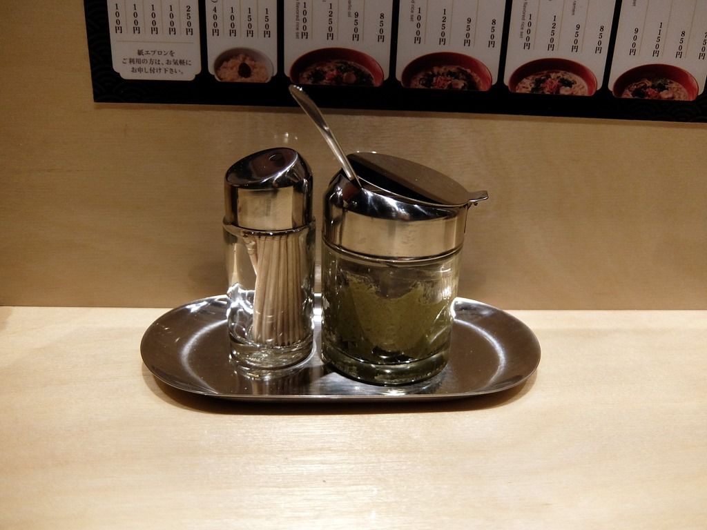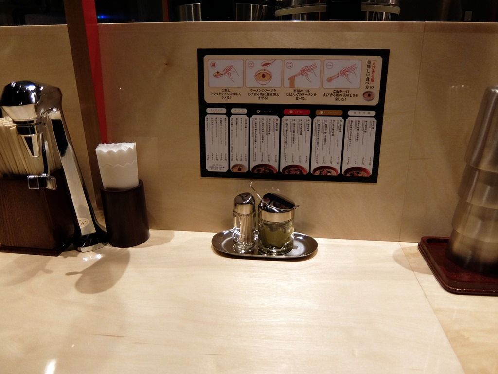 卓上調味料は、ゆず胡椒。 カウンターの掲示物は、「えび香る飯」のおいしい食べ方付き3ヶ国語メニュー。