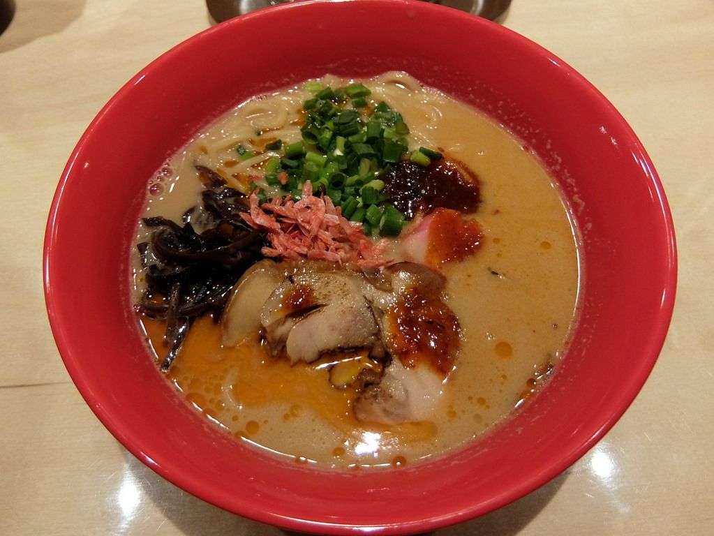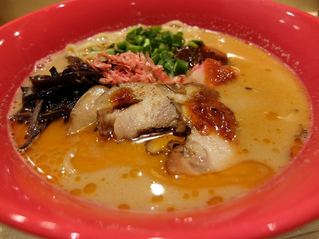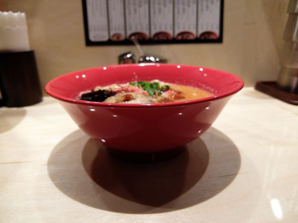 上野店と同じ赤い丼で登場。 具は、桜えび、味付けきくらげ、わけぎ、鶏チャーシュー、麸。