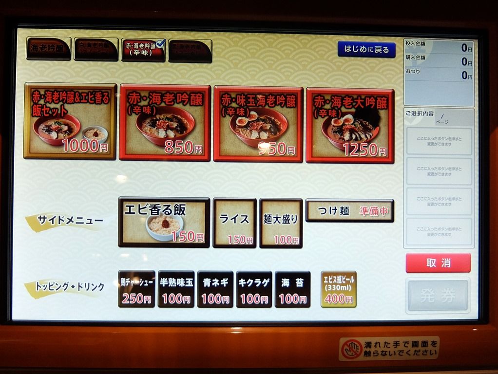 主なメニューは、海老吟醸750円、白・海老吟醸(クリーミー)850円、赤・海老吟醸(辛味)850円、黒・海老吟醸(マー油)850円、エビ香る飯150円、他。つけ麺は準備中。上野店では、「海老吟醸」をいただいていたので、今回は「辛味」という「赤・海老吟醸」にしました。