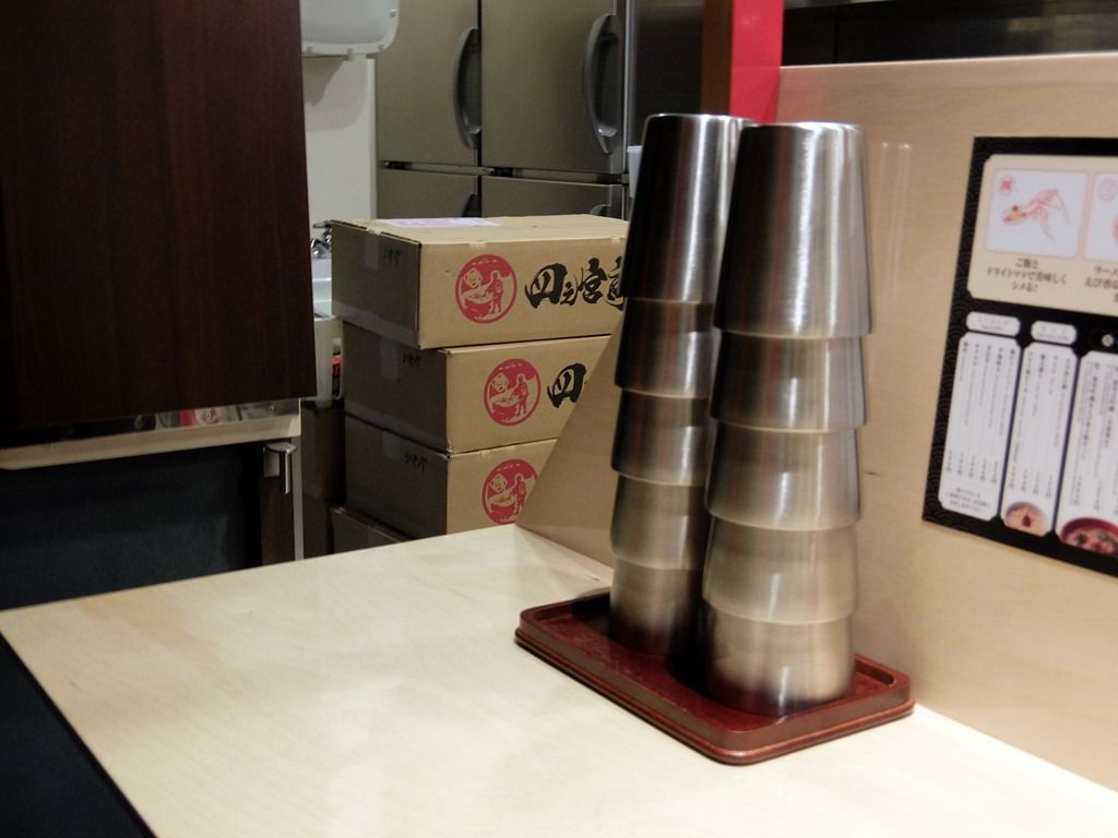 2席に一つの割合で、お冷用の蛇口が設置されていて、そこからセルフで給水する方式。