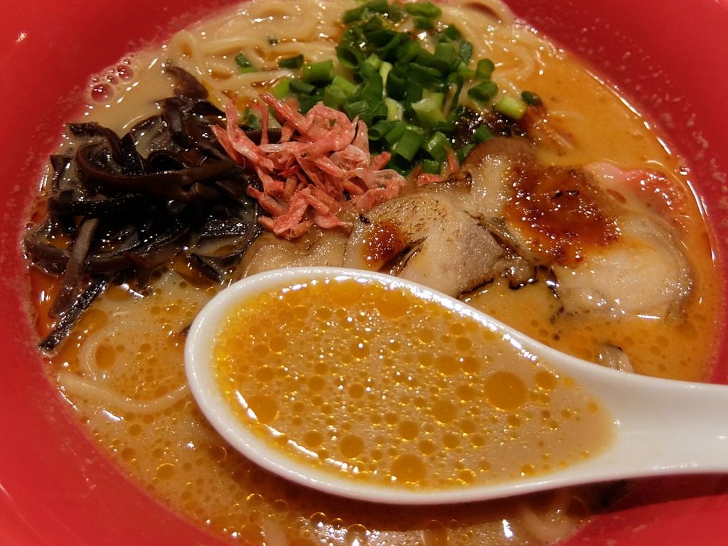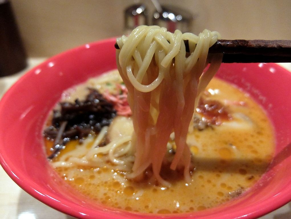 スープは、すこしだけとろみのある豚骨+海老出汁。 海老がガツンと効いてますが、上野店に比べるとやや海老が弱い気がします。