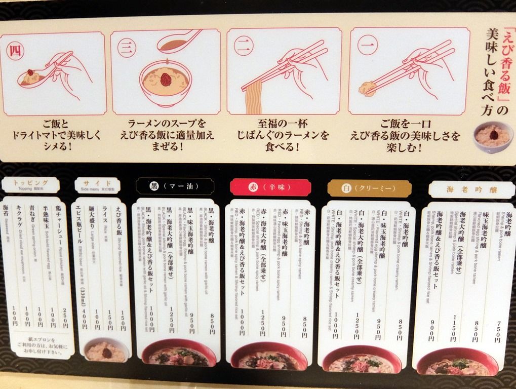 他にも壁面看板いろいろ。 「えび香る飯」の美味しい食べ方とか、