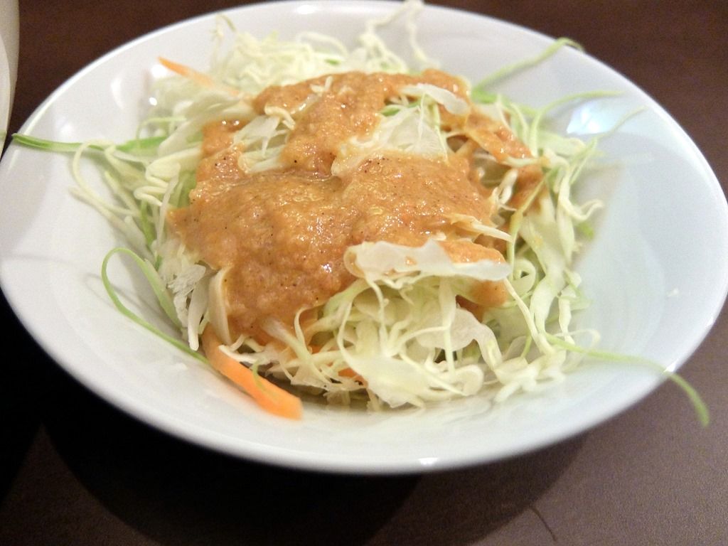 サラダは、生のキャベツと人参少々の千切り。 確かに外食が多いと野菜が不足しがちで、これは嬉しい配慮!