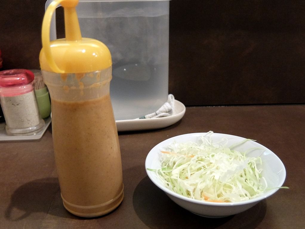 何故か最初に、サラダとドレッシングが登場。 びっくりして、「らーめん注文したんですけど、付いてくるんですか?」って聞いちゃいました。