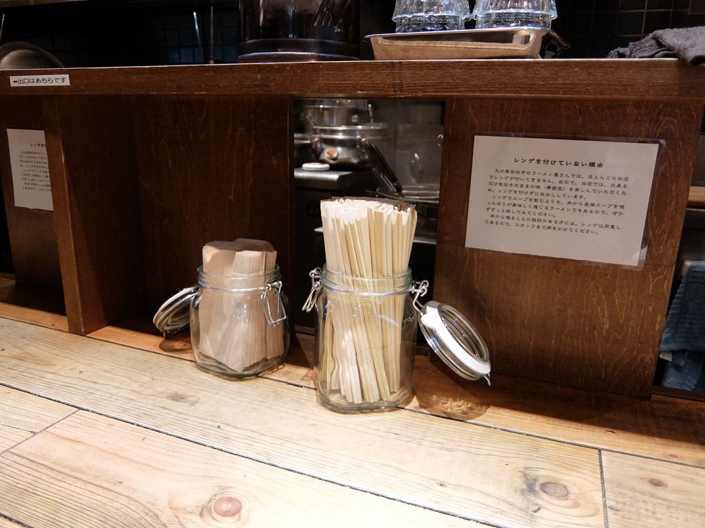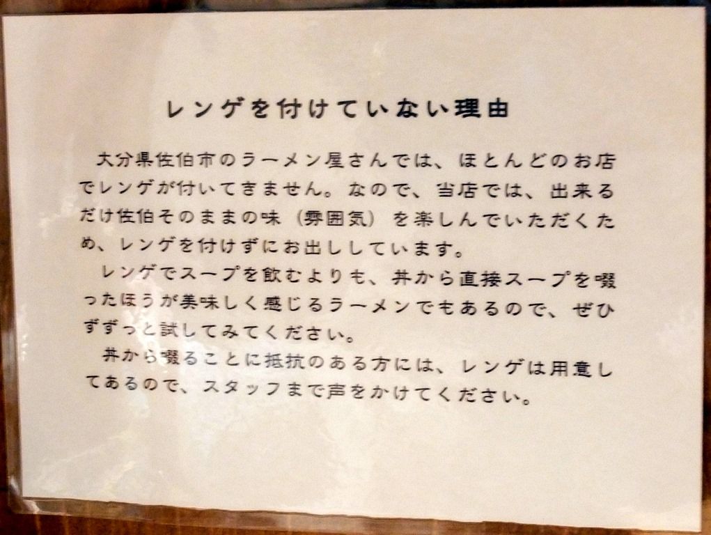 カウンターには、「レンゲを付けていない理由」が掲示されています。ちなみにその理由は、地元のほとんどのお店がレンゲ無しだからだそうです。