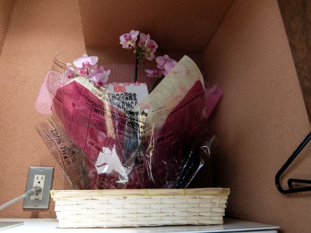 券売機上には、あんみつの深緑堂からの花も。