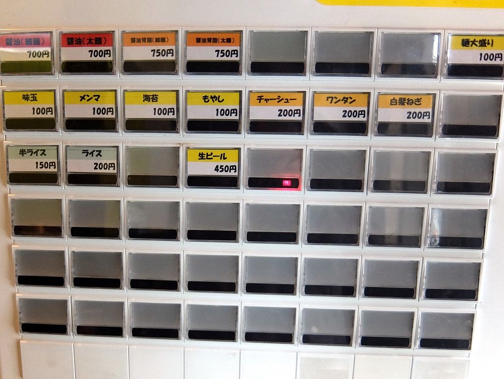 主なメニューは、醤油(細麺)700円、醤油(太麺)700円、背脂醤油(細麺)750円、背脂醤油(太麺)750円、他。オーダは券売機先頭左端の「醤油(細麺)」にしました。