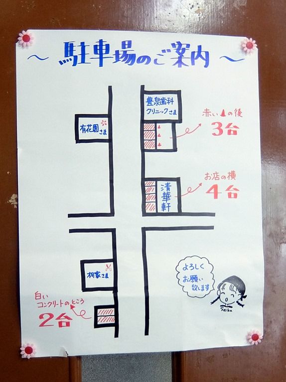 駐車場は店の横に4台、近くの歯科医院横に3台と民家横の駐車スペースに2台。