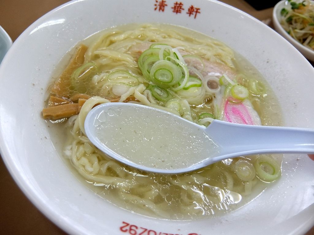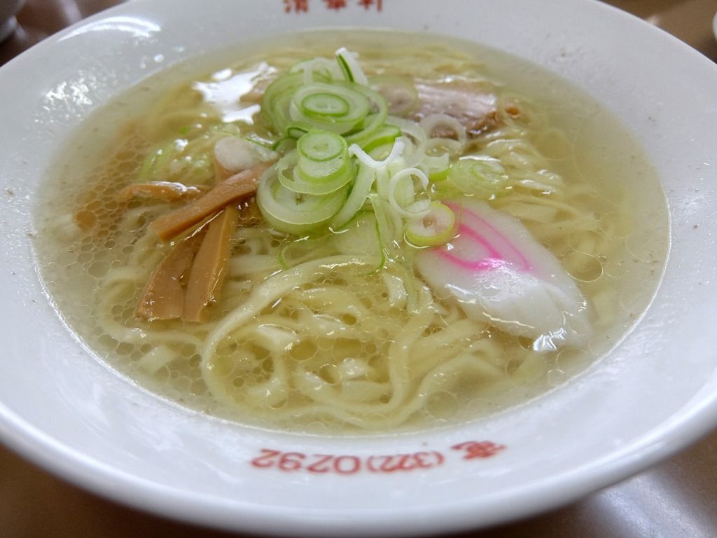 スープは、丼の底まで見透せそうな程透明度の高い清湯塩味。