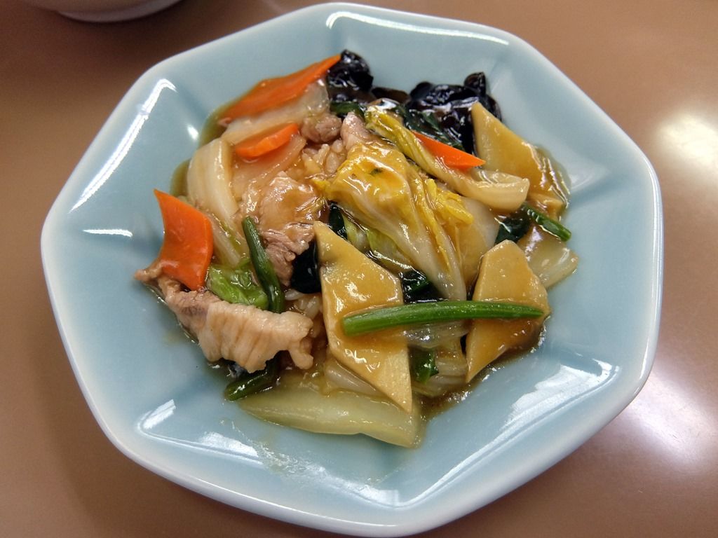 セットの「半中華丼」。具は、きくらげ、ニンジン、タケノコ、豚肉、いんげん、白菜、他。ハーフサイズながら量も多め。醤油味の中華丼でシンプルながら美味しい!