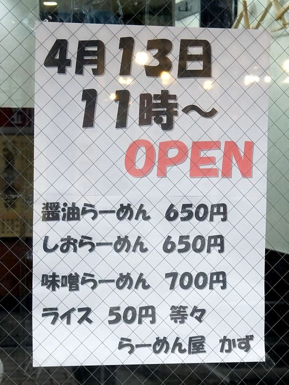 2015年4月13日、本日オープンの新店「らーめん屋 かず」へ。