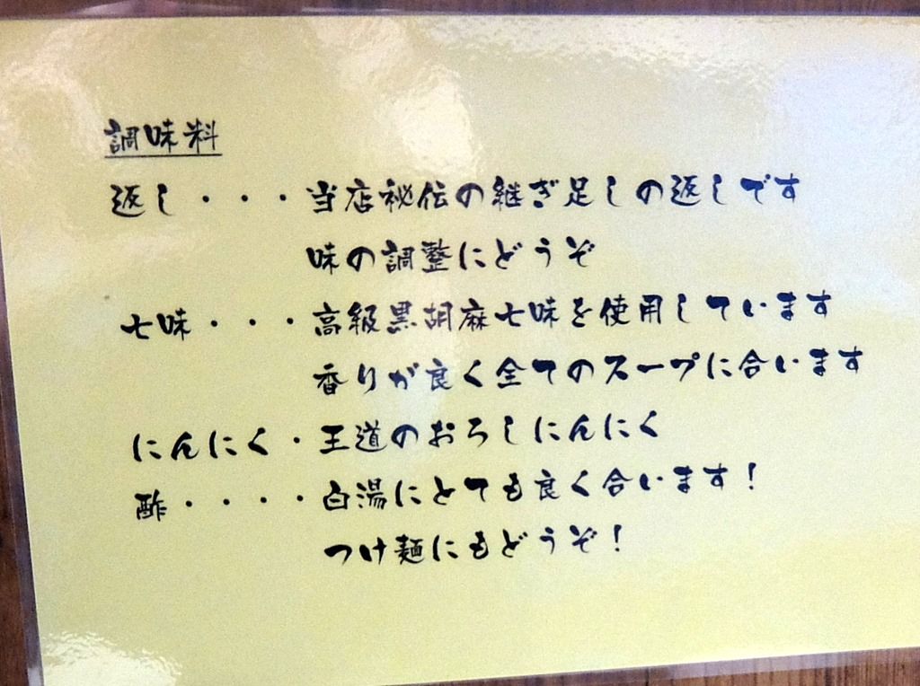 カウンターには、調味料の説明掲示。