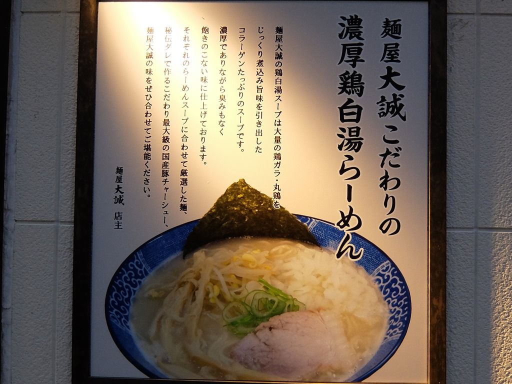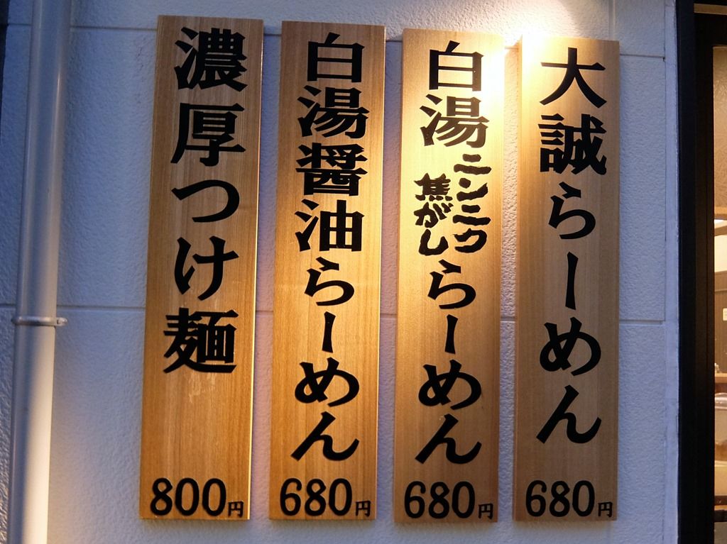 主なメニューは、(白湯・魚介Wスープ)大誠ラーメン680円、(濃厚白湯スープ)白湯ラーメン塩680円、(白湯ニンニク焦がし)白湯ニンニク焦がしラーメン680円、(あっさり醤油白湯)醤油白湯ラーメン680円、(つけ麺・白湯・魚介Wスープ)濃厚つけ麺 200g・300g 800円、他。