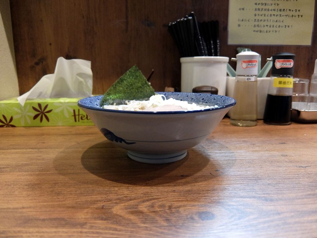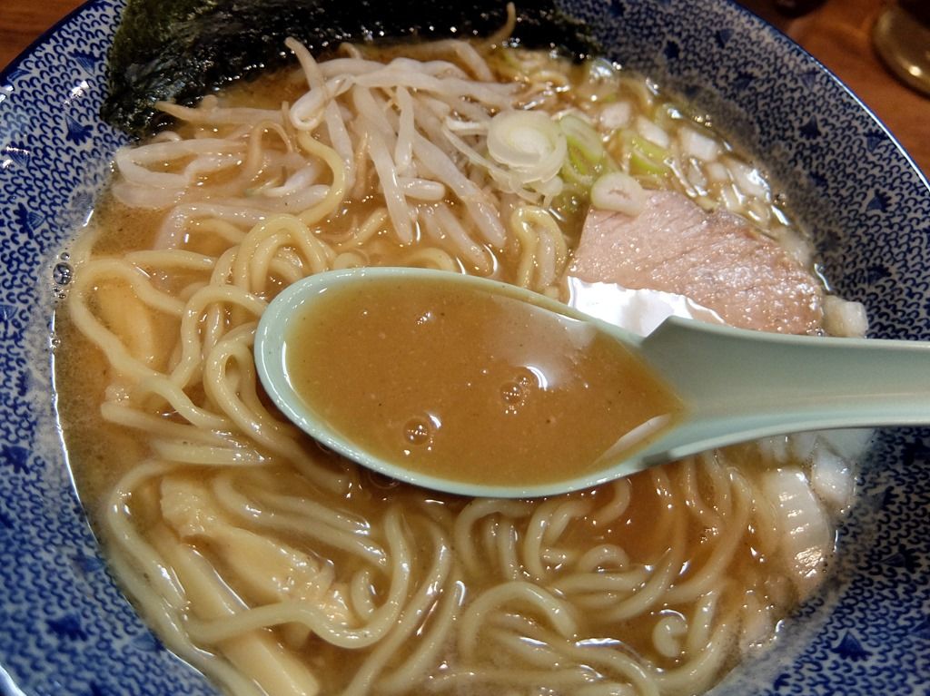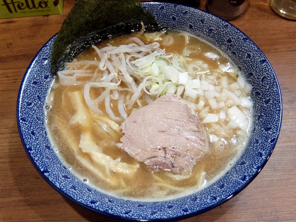 カウンター越しではなく、わざわざ客席を運んできての提供。 具は、海苔、ゆでもやし、穂先メンマ、チャーシュー、きざみ玉ねぎ、きざみネギ。