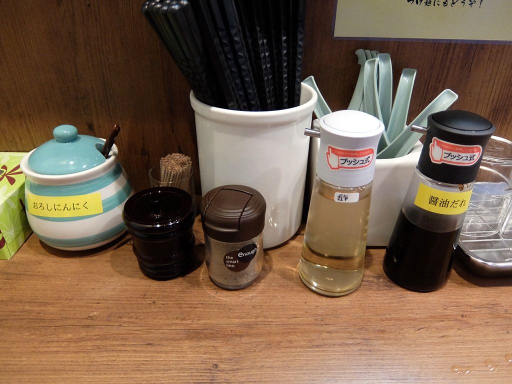 卓上調味料は、おろしニンニク、黒七味、故障、酢、醤油だれ。