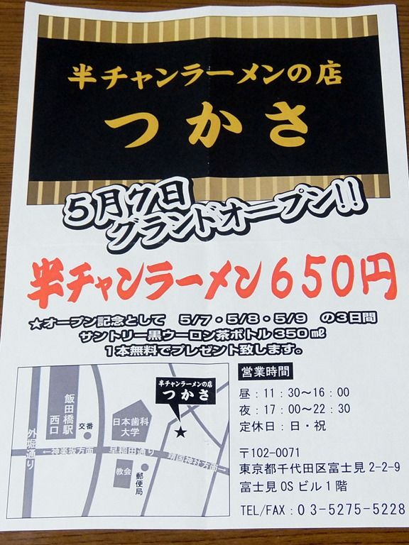 2015年5月7日本日オープン新店「半チャンラーメンの店 つかさ」へ。